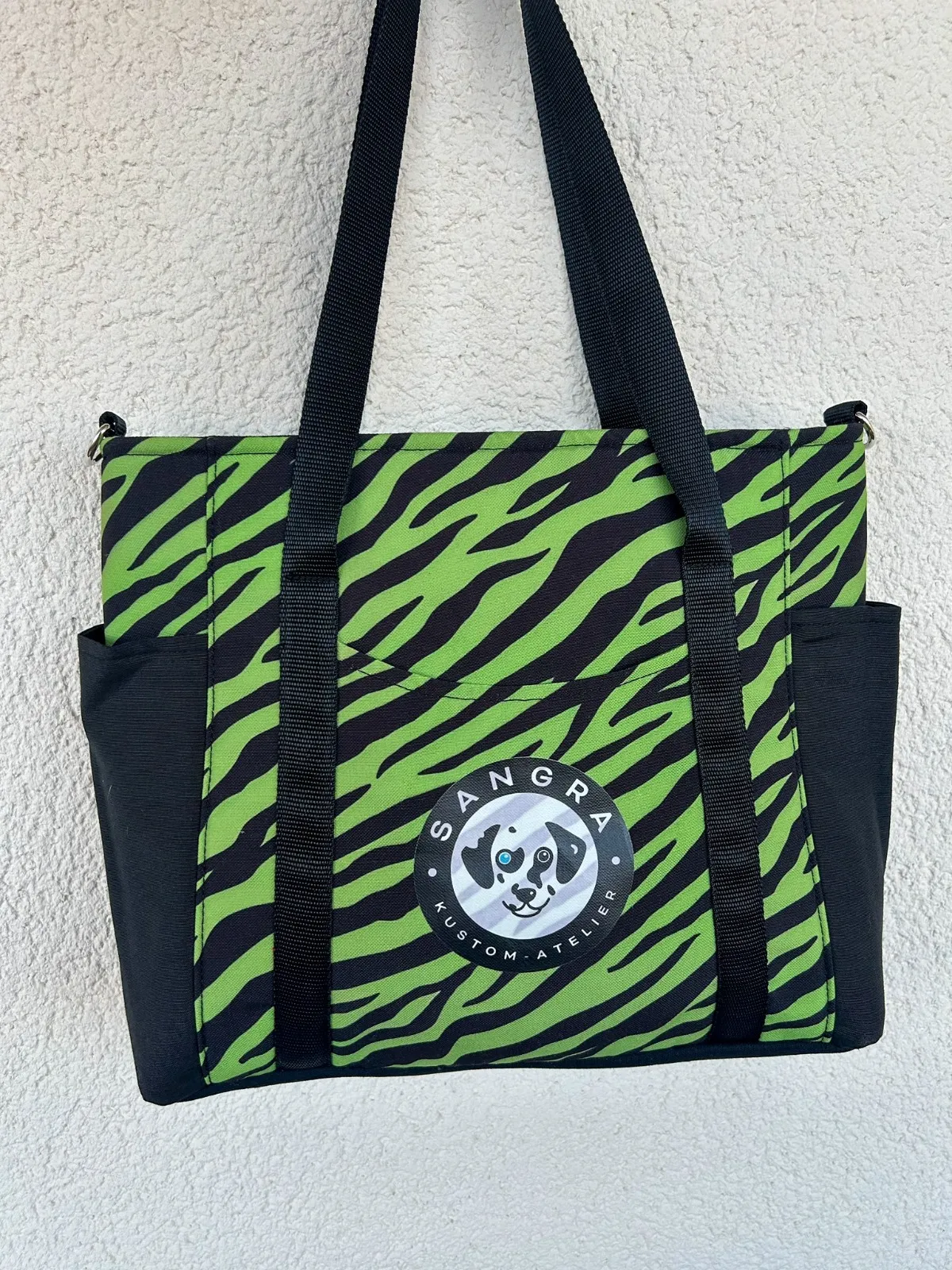 Bolso tote Selva Negra: una explosión de color y funcionalidad. Confeccionado en un vibrante estampado de cebra en tonos verde flúor y negro. Cuenta con cuatro bolsillos exteriores, uno interior, cierre de cremallera y asa extraíble y ajustable. El accesorio perfecto para tu día a día, con el sello único de la marca.
