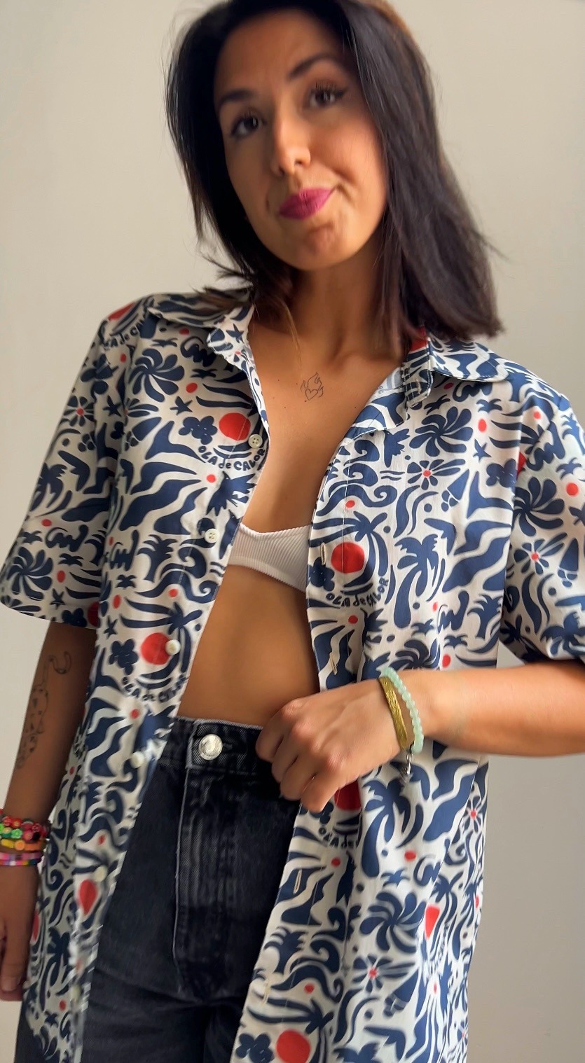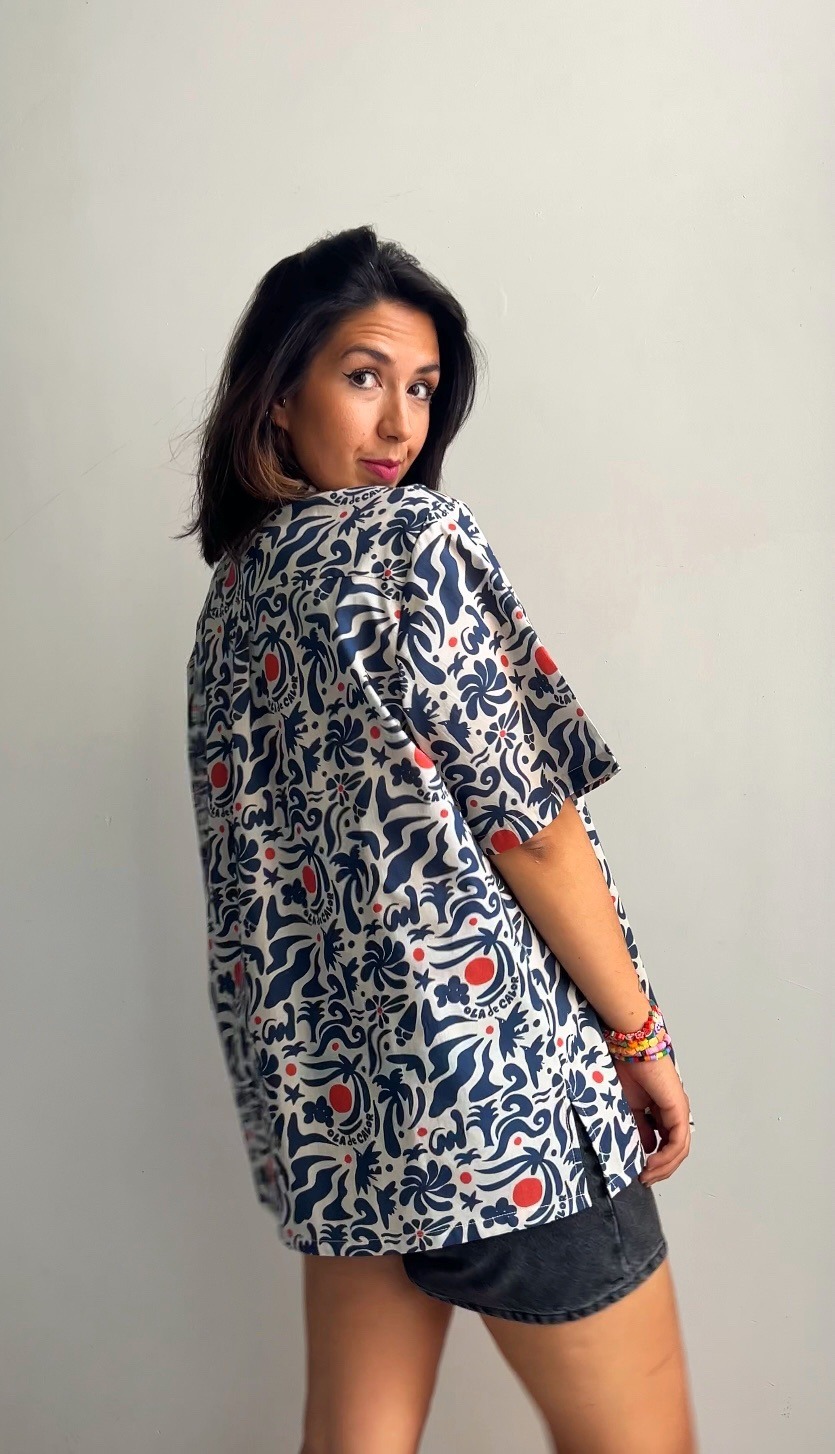 Su corte holgado y unisex la convierte en una prenda versátil y cómoda, perfecta para combinar con jeans, faldas o pantalones cortos. Es ideal para cualquier ocasión, ya sea un festival de música, una tarde de terraceo o simplemente para darle un toque de color a tus días. La camisa Ola de Calor es la prueba de que la moda puede ser atrevida, divertida y auténtica, sin perder la comodidad.