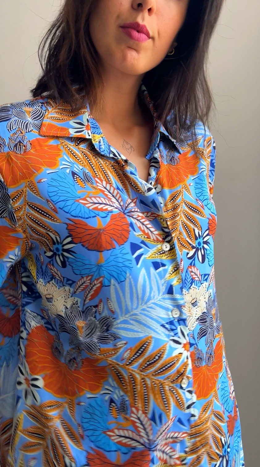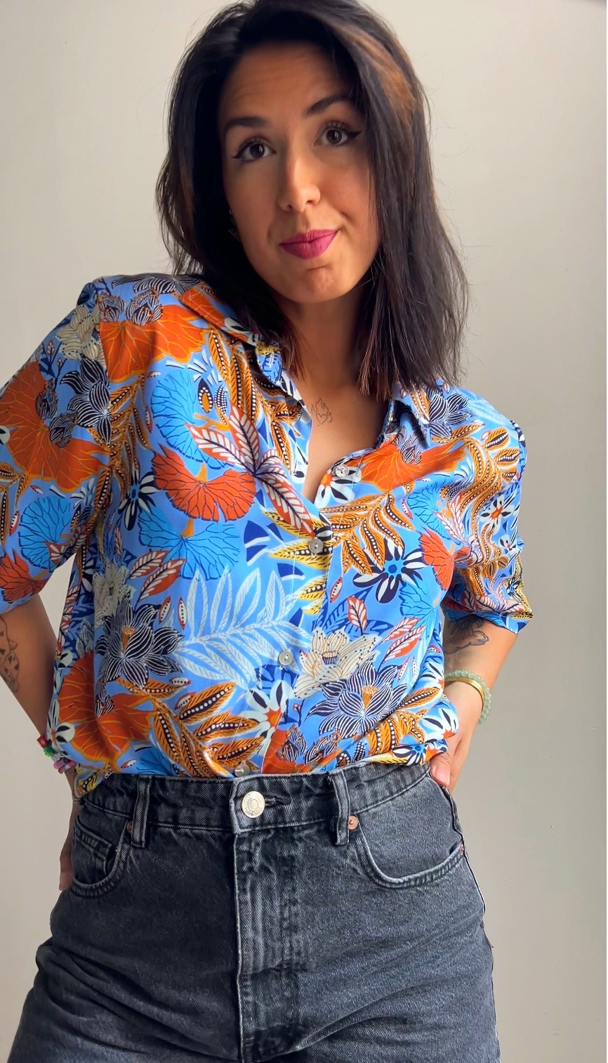 Añade un toque exótico a tu look con la camisa Tropical Vibe. Esta pieza, única y llena de vida, fusiona un estampado vibrante de hojas y flores tropicales en tonos azul celeste, naranja intenso y blanco. Cada diseño ha sido cuidadosamente pensado y confeccionado a mano en nuestro taller de Granada, asegurando que cada prenda sea exclusiva y con un toque muy personal.