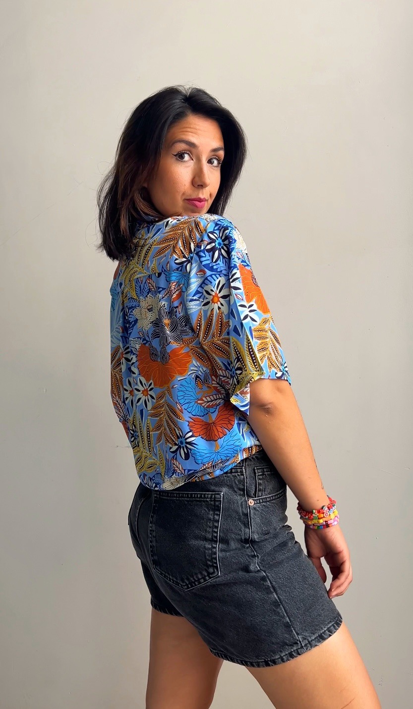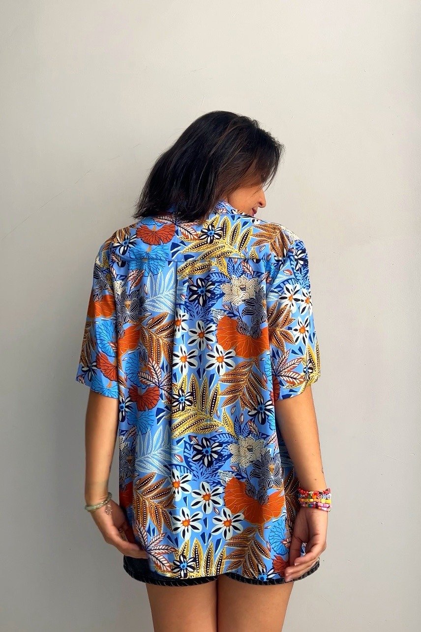 Camisa unisex Tropical Vibe: un diseño artesanal, vibrante y con un toque exótico. Combina un estampado de hojas y flores en tonos azules y naranjas. Hecha a mano en Granada para que tu estilo destaque.