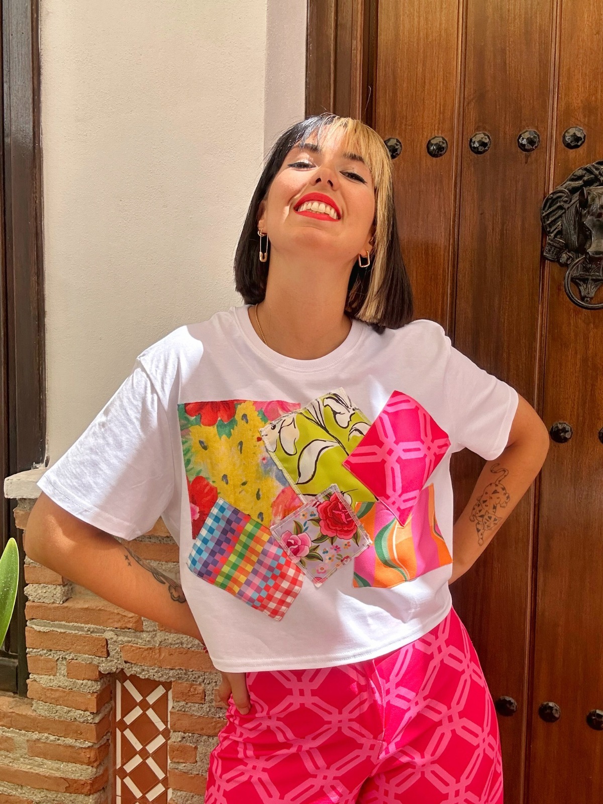 Camiseta Collage Marga: un diseño artesanal, colorido y atrevido. Customizada a mano con un collage de telas con distintos estampados y colores. Hecha a mano en Granada para que tu estilo sea único.