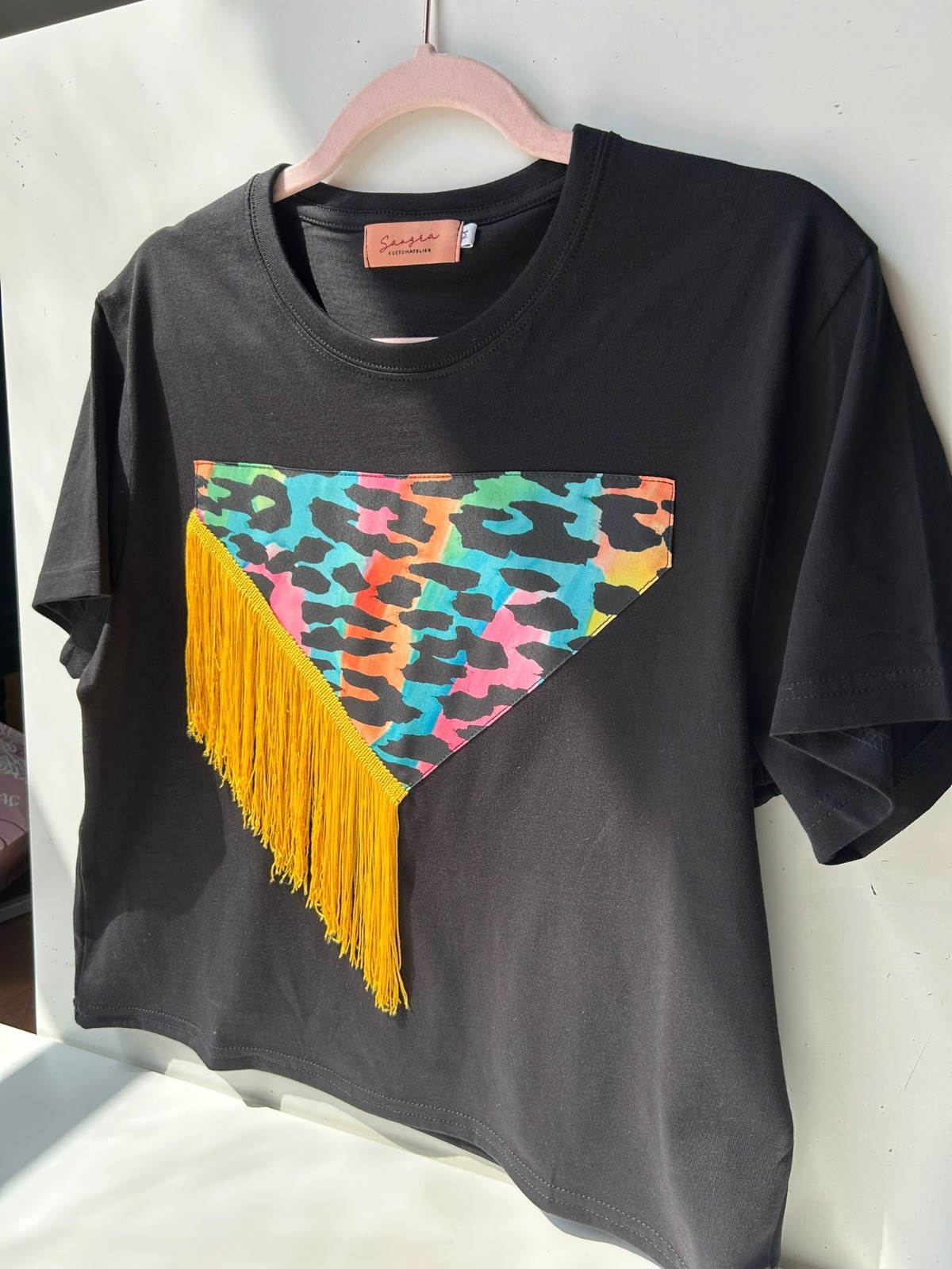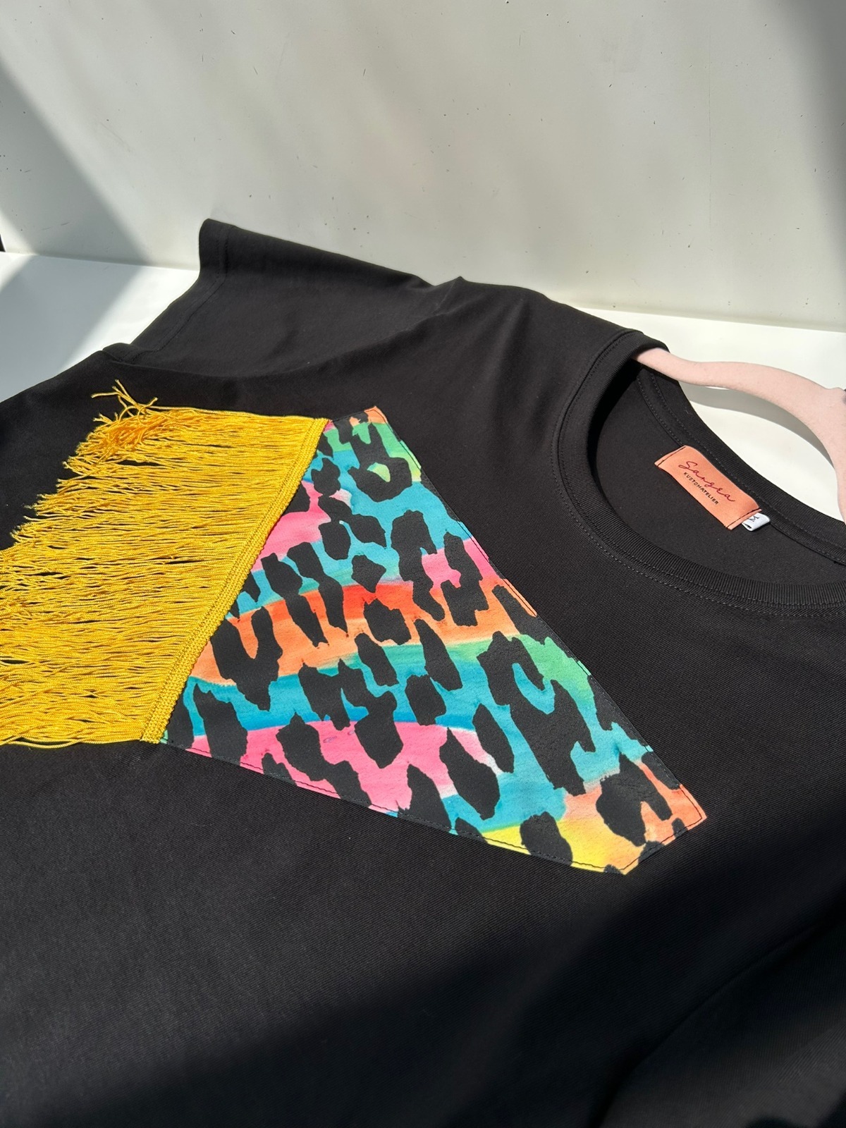 Camiseta Leopardo Multicolor: un diseño artesanal, atrevido y lleno de personalidad. Customizada a mano con un bolsillo con estampado de leopardo y flecos amarillos. Hecha a mano en Granada para que tu estilo destaque.