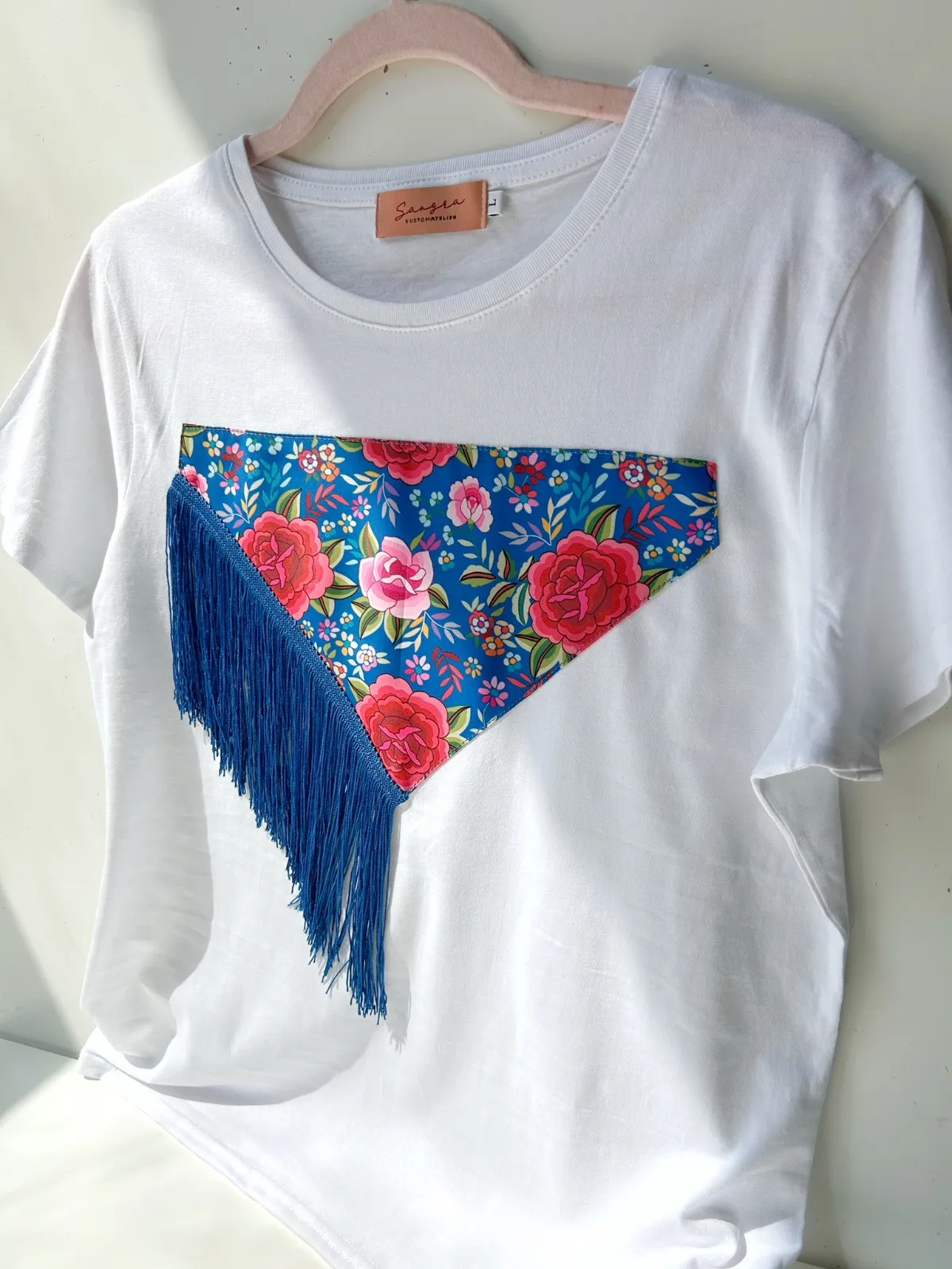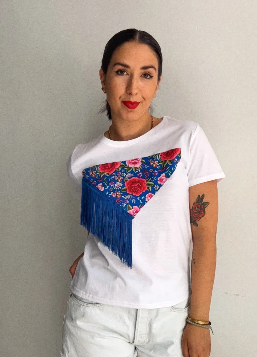 Camiseta Mantón de Manila Azul: un diseño artesanal, atrevido y lleno de arte. Confeccionada a mano con un estampado floral que evoca los mantones de Manila y flecos azules. Hecha a mano en Granada para que tu estilo sea único.