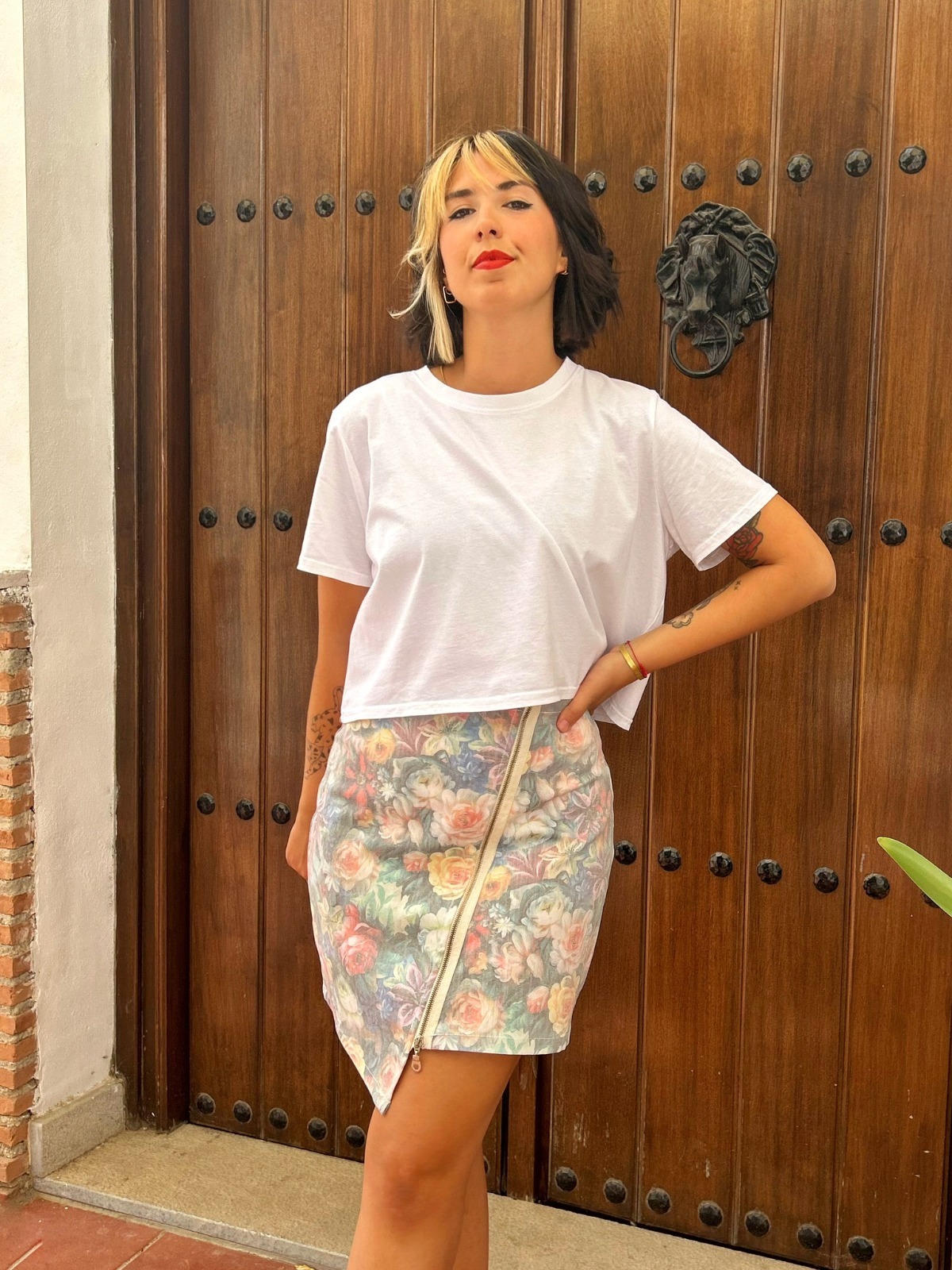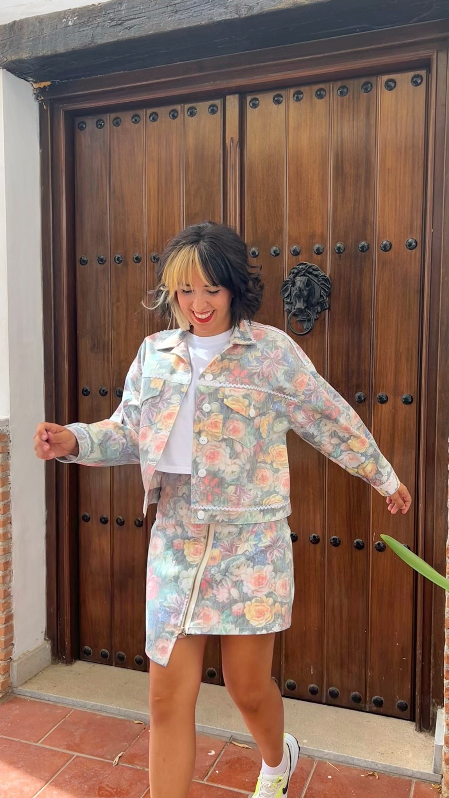 Descubre la delicadeza con un toque de rebeldía en el Conjunto Genoveva🌸. Esta no es solo una prenda, es un trozo de historia y arte que te permite llevar un estilo coordinado, romántico y audaz. El conjunto se compone de la Cazadora Genoveva y la Falda a juego, ambas confeccionadas con un tejido que evoca la belleza de los tapices antiguos. Su estampado de rosas y flores en tonos pastel crea una estética atemporal.