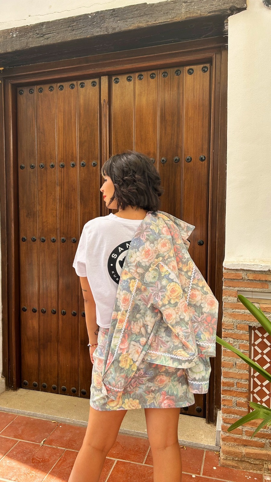 Conjunto Genoveva🌸: un diseño artesanal, romántico y atemporal. Se compone de cazadora y falda a juego, confeccionadas con un tejido de tapiz floral y detalles de puntilla. Una opción completa y versátil, hecha a mano en Granada.